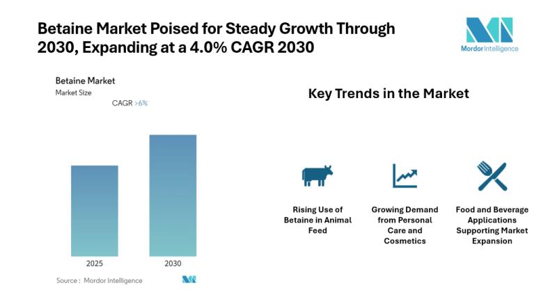 According to Mordor Intelligence, Betaine Market Size, Share & Trends Forecast 2025-2030," offers an in-depth analysis of the regional dynamics shaping this rapidly evolving industry.Global betaine market is projected to grow at CAGR value of 6.00% forecast 2025-2030. Betaine, a naturally occurring compound derived mainly from sugar beet processing, is widely valued for its role as a feed additive, food ingredient, and surfactant component. Its compatibility with both natural and synthetic formulations has helped maintain consistent demand across regions.