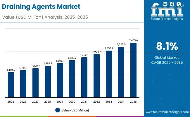 The global Draining Agents Market is on a powerful growth trajectory, expected to more than double in size from USD 1,104.7 million in 2025 to USD 2,405.6 million by 2035. This remarkable 118% increase, representing a CAGR of 8.1%, signals immense opportunity for both established industry leaders and emerging manufacturers aiming to expand their footprint through innovative technologies and sustainable ingredient sourcing.Subscribe for Year-Round Insights → Stay ahead with quarterly and annual data updates - https://www.futuremarketinsights.com/reports/sample/rep-gb-26416