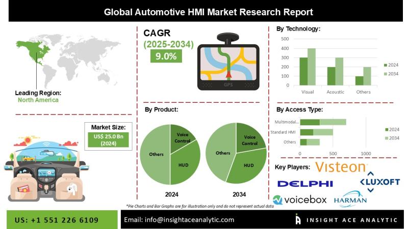 InsightAce Analytic Pvt. Ltd. announces the release of a market assessment report on the "Global Automotive HMI Market Size, Share & Trends Analysis Report By Product (Voice Recognition System, Rotary Controllers, Gesture Recognition, Touch Screen Display, Instrument Cluster Display, Steering Mounted Control System, Head-Up Display, Multifunction Switches), By Access Type (Standard HMI System, Multimodal HMI System), By Technology (Visual Interface, Acoustic Interface), By Display Size (10"), By Vehicle Type (Passenger…