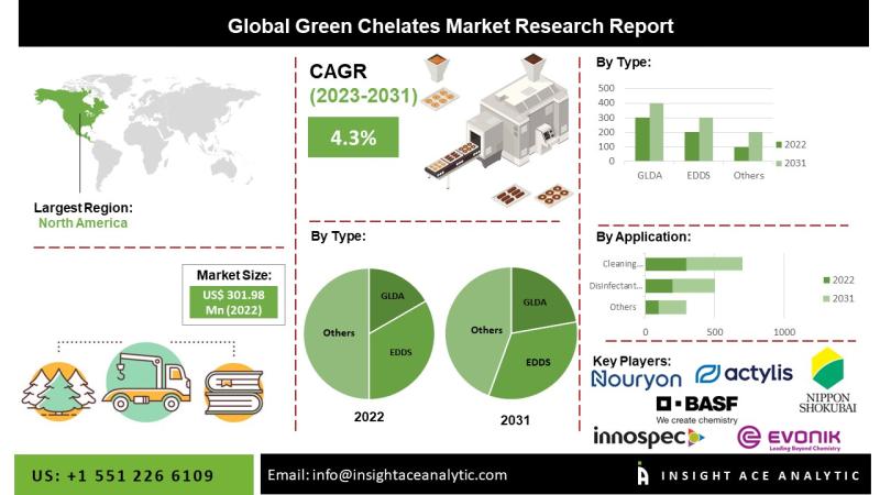 InsightAce Analytic Pvt. Ltd. announces the release of a market assessment report on the "Global Green Chelates Market Size, Share & Trends Analysis Report By Type (Sodium Gluconate, Ethylenediamine-N, N'-disuccinic acid (EDDS), L-glutamic acid N, N-diacetic acid (GLDA), Methyl glycindiacetic acid (MGDA)), Application (disinfectant formulations, cosmetics/ personal care products formulation, pharmaceutical products formulations, cleaning solutions formulation, laundry detergents formulation, pulp and paper production, agrochemicals production, food processing, and water treatment), Region, Market Outlook And Industry Analysis 2031"The global green chelates market is estimated to reach over USD 438.78 million by 2031, exhibiting a CAGR of 4.3% during the forecast period.