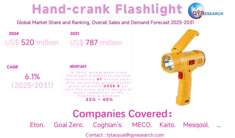 Global leading market research publisher QYResearch published the release of its latest report, "Hand-crank Flashlight - Global Market Share, Ranking, Sales, and Demand Forecast 2025-2031". This in-depth report provides a complete analysis of the global Hand-crank Flashlight market, offering critical insights into market size, share, demand, industry development status, and future forecasts. Whether you're a stakeholder, investor, or…
