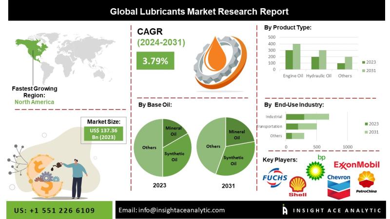 InsightAce Analytic Pvt. Ltd. announces the release of a market assessment report on the "Global Lubricants Market Size, Share & Trends Analysis Report By Base Oil (Mineral Oil, Synthetic Oil, Bio-based Oil), Product Type (Engine Oil, Hydraulic Fluid, Metalworking Fluid), End-Use Industry (Transportation and Industrial lubricants)- Market Outlook And Industry Analysis 2034"