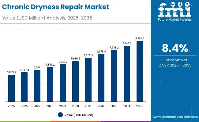 The Chronic Dryness Repair Market is on an impressive growth trajectory, projected to surge from a valuation of USD 3,803.2 million in 2025 to a staggering USD 8,501.6 million by 2035, marking a robust 123.5% increase over the decade. This translates into a compound annual growth rate (CAGR) of 8.4%, signaling strong demand driven by rising skin health awareness, innovative technologies, and shifting consumer preferences globally.
