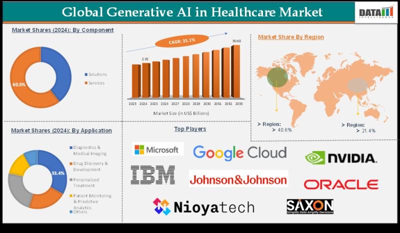 Generative AI in Healthcare Market to Reach US$ 30.68 Billion by 2033 at 35.1% CAGR; North America Leads with ~42% Share - Key Players: Microsoft, IBM, Google