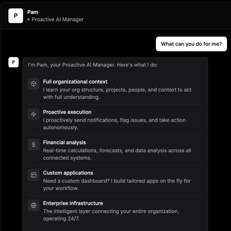 Unlike standard chatbots that reset after every conversation, PAM serves as a state-aware "Chief of Staff."