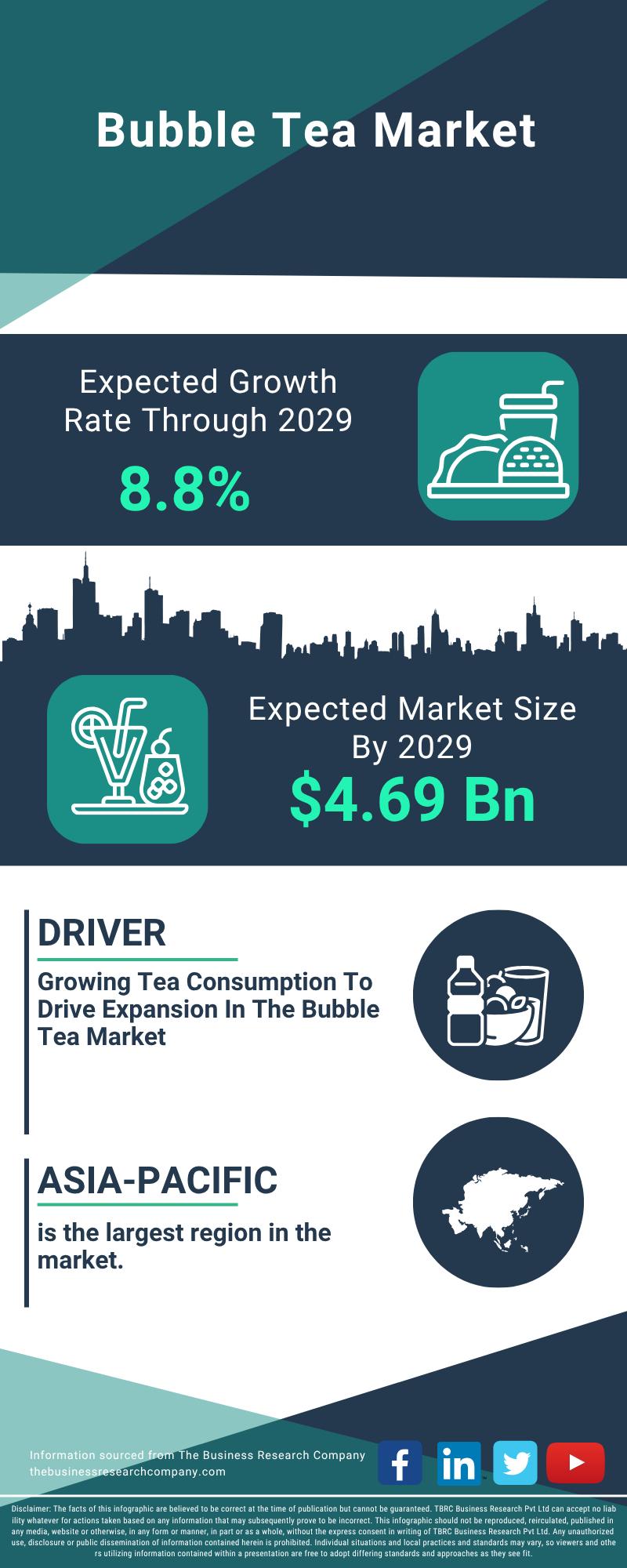 The bubble tea market is forecasted to experience significant expansion in the coming years, projected to reach a value of $4.69 billion by 2029. This growth corresponds to a compound annual growth rate (CAGR) of 8.8%. Several factors are propelling this upward trend, including a broader variety of menu options, endorsements from celebrities and influencers, enhanced mobile ordering and delivery services, sustainability efforts, and the rise of specialty and premium bubble tea products. Key trends shaping the market over the forecast period include limited edition and specialty offerings, a growing focus on health and wellness, customized and personalized drinks, eco-friendly initiatives, and creative fusion beverages.