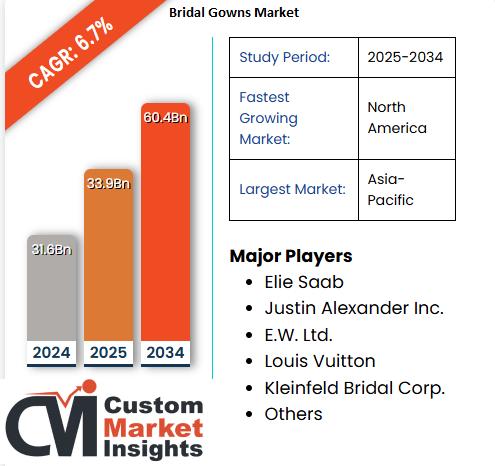 Global Bridal Gowns Market size was valued at USD 33.9 Billion in 2025 and expected to reach USD 60.4 Billion by 2034, at CAGR of 6.7% during the forecast period 2025- 2034.