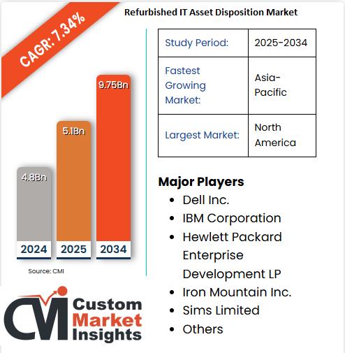 The Global Refurbished IT Asset Disposition Market size was valued at USD 5.1 Billion in 2025 and is expected to reach USD 9.75 Billion by 2034, at a CAGR of 7.34% during the forecast period 2025 - 2034.