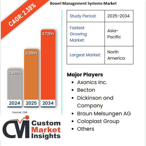 Global Bowel Management Systems Market size was valued at USD 3.01 Billion in 2025 and is expected to reachUSD 3.72 Billion by 2034, at a CAGR of 2.38% during the forecast period 2025 - 2034.