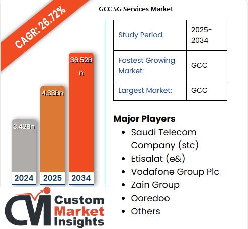 As per the GCC 5G Services Market size analysis conducted by the CMI Team, the GCC 5G Services Market is expected to record a CAGR of 26.72% from 2025 to 2034. In 2025, the market size is projected to reach a valuation of USD 4.33 Billion. By 2034, the valuation is anticipated to reach USD 36.52 Billion.➤ Request Free Sample PDF Report @ https://www.custommarketinsights.com/request-for-free-sample/?reportid=66795