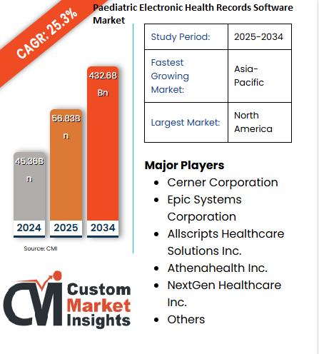 Global Paediatric Electronic Health Records Software Market size was valued at USD 56.83 Billion in 2025 and expected to reach USD 432.68 Billion by 2034, at CAGR of 25.3% during the forecast period 2025 - 2034.