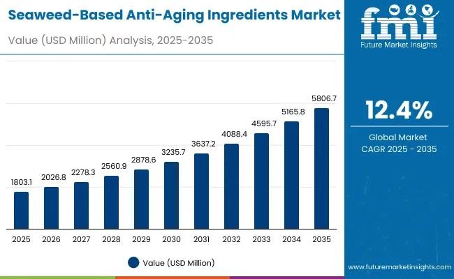 The global seaweed-based anti-aging ingredients market is entering a transformative decade, driven by rising consumer demand for natural, sustainable, and clinically validated skincare solutions. Valued at USD 1,803.1 million in 2025, the market is forecast to reach USD 5,806.7 million by 2035, registering a robust CAGR of 12.4%. This expansion represents an absolute growth of USD 4,003.6 million, highlighting the accelerating adoption of marine-derived actives across premium skincare and dermocosmetic…