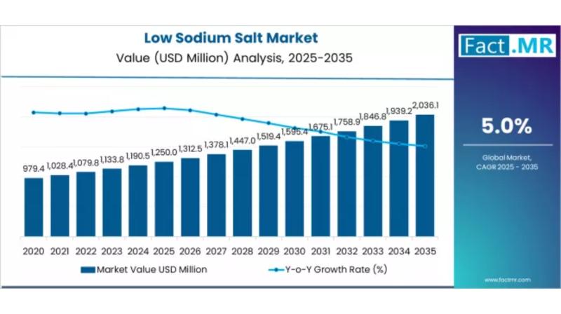 The global low sodium salt market is entering a decade of steady and transformative growth as rising health awareness, regulatory pressure, and evolving dietary preferences drive reduced sodium consumption worldwide. According to Fact.MR, the market is projected to expand from USD 1,250 million in 2025 to USD 2,036.1 million by 2035, registering a CAGR of 5% during the forecast period.