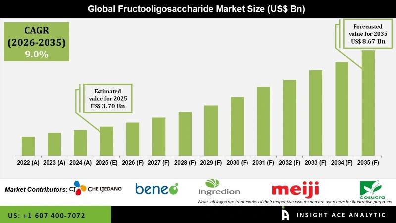 Fructooligosaccharide Market Size is valued at USD 3.70 Billion in 2025 and is predicted to reach USD 8.67 Billion by the year 2035 at a 9.0% CAGR during the forecast period of 2026 to 2035.