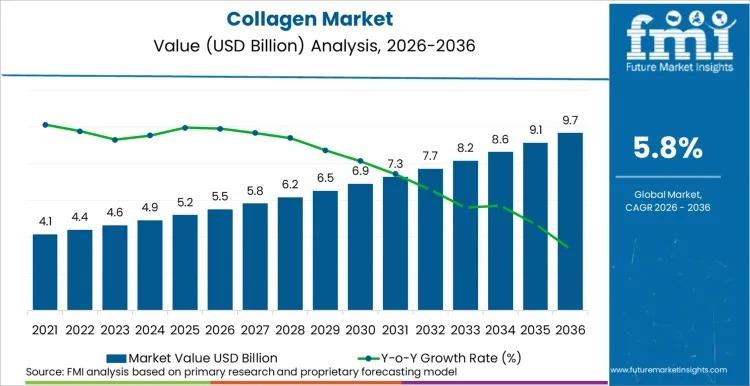 The Global Collagen Market is projected to expand from USD 5,501.60 million in 2026 to USD 9,627.80 million by 2036, registering a CAGR of 5.8%. Market expansion is being structurally shaped by hydrolysis precision, extraction efficiency, and molecular standardization rather than short-term consumption volatility.