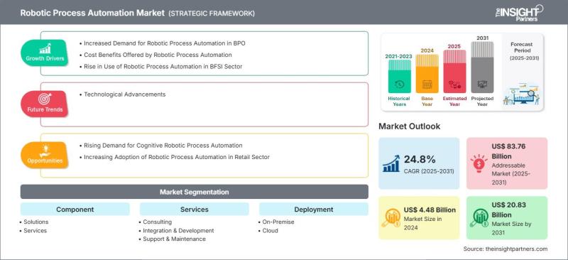 The robotic process automation market size is expected to reach US$ 20.83 billion by 2031 from US$ 4.48 billion in 2024. The market is estimated to record a CAGR of 24.8% during 2025-2031. The growing technological advancement is likely to bring new trends in the market in the coming years. Download PDF Sample Copy @ https://www.theinsightpartners.com/sample/TIPTE100001271/?utm_source=OpenPR&utm_medium=10813 Robotic Process Automation (RPA) continues to transform business operations by automating repetitive tasks, much like a
