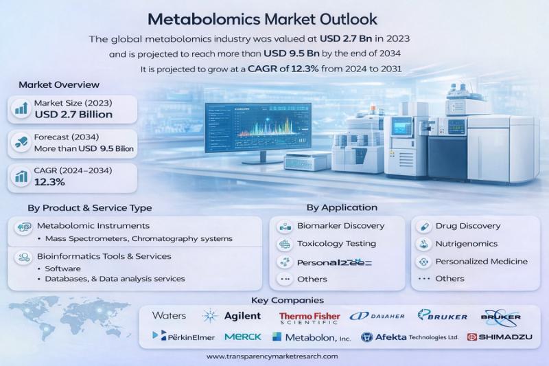 The global metabolomics market was valued at USD 2.7 billion in 2023 and is expected to reach more than USD 9.5 billion by the end of 2034. The industry is projected to expand at a robust CAGR of 12.3% from 2024 to 2034, driven by rising applications in precision medicine, biomarker discovery, drug development, and advancements in analytical technologies such as mass spectrometry and NMR spectroscopy.Growth in demand for personalized medicine, surge in prevalence of chronic diseases, increase in use of metabolomics approaches in drug discovery, rise in investments in R&D activities, and advent of innovative analytical instruments and software are driving the metabolomics market growth.