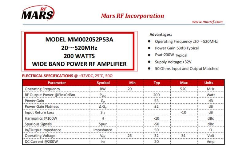 Mars RF's low-distortion broadband high power amplifier: MM002052P53A [https://www.marsrf.com/low-distortion-rf-broadband-high-power-amplifiers-mm002052p53a-product/]. This product focuses on the 20-520MHz band, delivering up to 200W of output power while achieving leading low-distortion performance, aiming to provide the ultimate solution for high-end applications that combines "powerful performance" and "clean output".