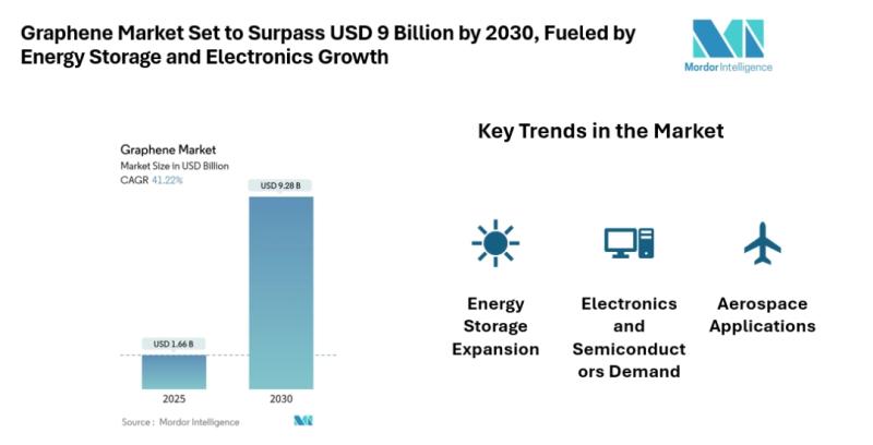 The global [https://www.mordorintelligence.com/industry-reports/graphene-market?utm_source=industrytoday] projected to rise from USD 1.66 billion in 2025 to USD 9.28 billion by 2030, reflecting a striking 41.22% CAGR during the forecast period. This growth signals that graphene is steadily moving from research labs into mainstream industrial supply chains.