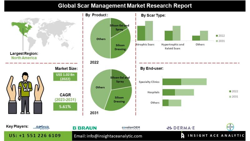 InsightAce Analytic Pvt. Ltd. announces the release of a market assessment report on the "Global Scar Management Market- (By Product (Silicone gel and spray, Silicon dressing, Cream and ointment, Others), By Scar Type (Atrophic scars, Hypertrophic and keloid scars, Others), By End-User (Hospitals, Specialty clinics, Home healthcare)), Trends, Industry Competition Analysis, Revenue and Forecast To 2031."