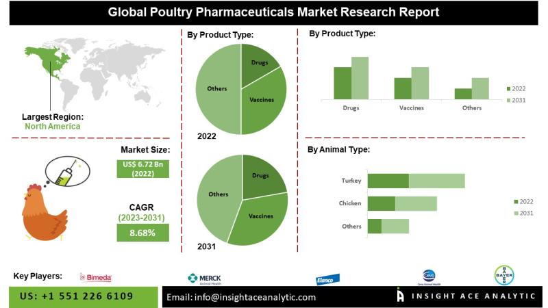 InsightAce Analytic Pvt. Ltd. announces the release of a market assessment report on the "Global Poultry Pharmaceuticals Market- (By Product Type (Drugs (Vetrimoxin, Other drug products), Vaccines (Innovax, Nobilis, Poulvac, Other vaccine products), Feed Additives (VIGOSINE, Amnovit, Other feed additives)), By Animal Type (Chicken, Turkey, Duck, Goose, Others)), Trends, Industry Competition Analysis, Revenue and Forecast To 2031."According to the latest research by InsightAce Analytic, the Global Poultry Pharmaceuticals Market is valued at US$ 6.72 Bn in 2022, and it is expected to reach US$ 14.03 Bn by 2031, with a CAGR of 8.68% during a forecast period of 2023-2031.