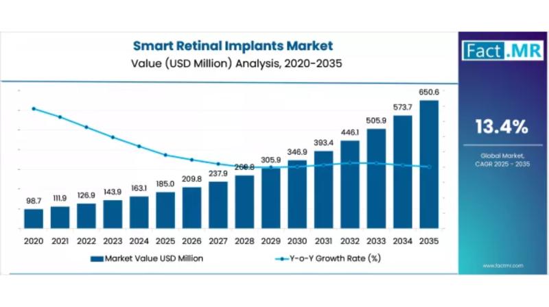 The global smart retinal implants market is set for strong and sustained growth, driven by rapid advancements in neuroprosthetics, rising prevalence of retinal degenerative disorders, and increasing investment in vision-restoration technologies. According to Fact.MR, the market is projected to expand from USD 185.0 million in 2025 to approximately USD 650.0 million by 2035, recording an absolute increase of USD 465.0 million over the forecast period.