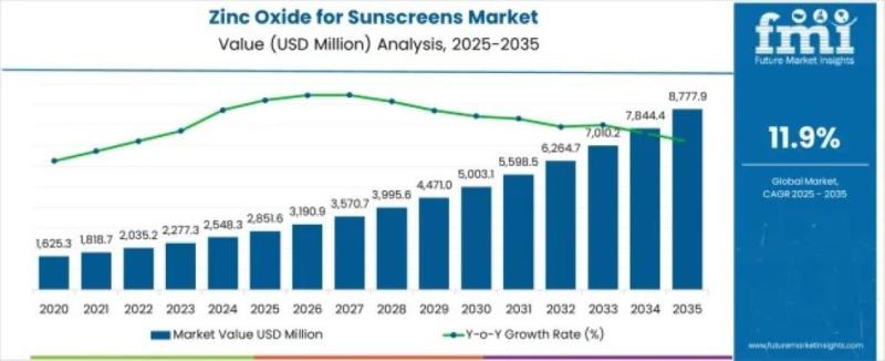 The global Zinc Oxide for Sunscreens Market is entering a transformative growth phase, driven by rising skin cancer awareness, clean beauty adoption, and rapid innovation in mineral-based UV protection technologies. According to the latest industry analysis, the market is projected to grow from USD 2,851.6 million in 2025 to approximately USD 8,777.9 million by 2035, registering a robust CAGR of 11.9%. Over the forecast period, the market will expand by nearly 3.07X, creating significant opportunities for both established manufacturers and emerging players developing next-generation sunscreen technologies.Market Outlook: Why Zinc Oxide Is the Future of Sun Protection