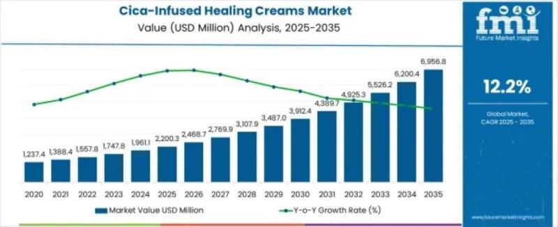 The global Cica-infused healing creams market is on a transformative growth trajectory, expected to surge from USD 2,200.3 million in 2025 to nearly USD 6,956.8 million by 2035. This impressive expansion, a 215.9% increase over the next decade, is fueled by rising consumer awareness about the healing benefits of Centella Asiatica (commonly known as Cica), evolving skincare needs, and breakthrough advancements in botanical extraction technologies.As both established and emerging manufacturers innovate and expand their footprints, the market is witnessing an exciting blend of tradition and technology, backed by strong consumer demand for gentle, effective, and scientifically-backed skincare solutions.