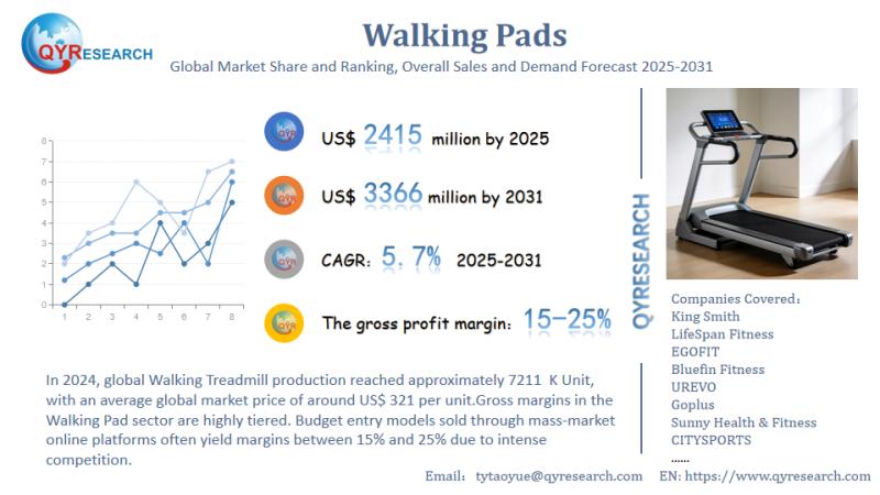 The global market for Walking Pads was estimated to be worth US$ 2315 million in 2024 and is forecast to a readjusted size of US$ 3366 million by 2031 with a CAGR of 5.7% during the forecast period 2025-2031. Global Leading Market Research Publisher QYResearch announces the release of its latest report "Walking Pads - Global Market Share and Ranking, Overall Sales and Demand Forecast 2025-2031". Based on current situation and
