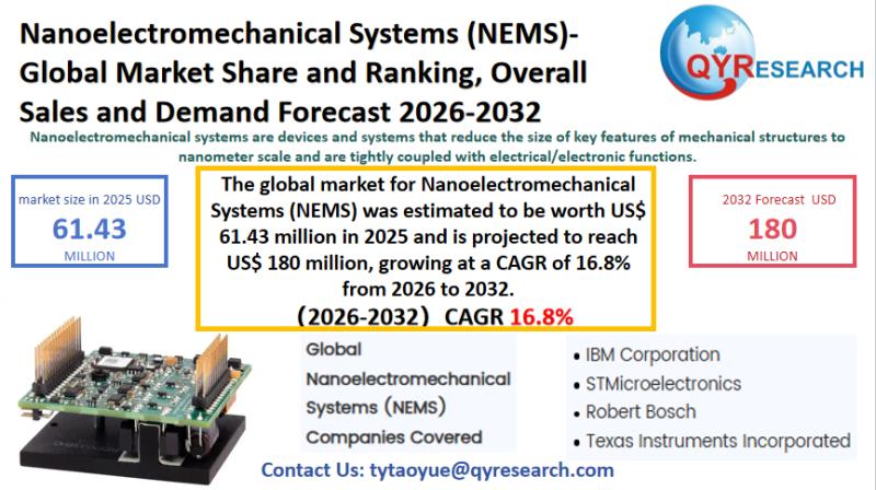 The global market for Nanoelectromechanical Systems (NEMS) was estimated to be worth US$ 61.43 million in 2025 and is projected to reach US$ 180 million, growing at a CAGR of 16.8% from 2026 to 2032.