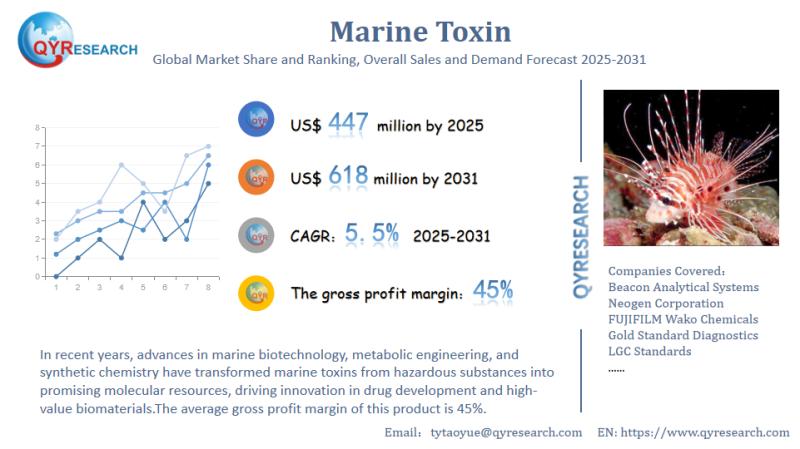 The global market for Marine Toxin was estimated to be worth US$ 421 million in 2024 and is forecast to a readjusted size of US$ 618 million by 2031 with a CAGR of 5.5% during the forecast period 2025-2031.Global Leading Market Research Publisher QYResearch announces the release of its latest report "Marine Toxin - Global Market Share and Ranking, Overall Sales and Demand Forecast 2025-2031". Based on current situation and impact historical analysis (2020-2024) and forecast calculations (2025-2031), this report provides a comprehensive analysis of the global Marine Toxin market, including market size, share, demand, industry development status, and forecasts for the next few years.