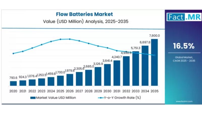 The global flow batteries market is set for strong and sustained growth, driven by the rapid expansion of renewable energy, increasing need for grid-scale energy storage, and rising investments in long-duration storage technologies. According to Fact.MR, the market is projected to grow from USD 1,700.0 million in 2025 to approximately USD 7,800.0 million by 2035, registering a robust CAGR of 16.5% during the forecast period.This growth represents an absolute increase of USD 6,100.0 million, translating into a total market expansion of 358.8% over the decade.