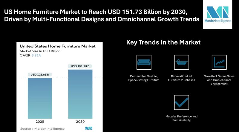 US Home Furniture Market OverviewThe US home furniture market size stands at USD 125.81 billion in 2025 and is forecast to reach USD 151.73 billion by 2030, translating to a 3.82% CAGR, supported by a consistent forecast period. This growth reflects changing consumer demand, remodeling activity, and lifestyle shifts including preference for versatile and multi-functional furniture suited for living spaces that serve multiple uses. Notably, demographic shifts and an increase in household formation have strengthened baseline demand. Together with improvements in sustainability and digital shopping experiences, these trends are shaping the competitive landscape. These figures are based on expert united states home furniture market analysis and highlight the steady expansion of one of the leading segments in home goods retailing.