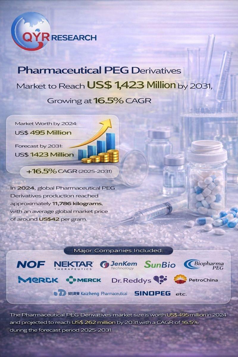 The global Pharmaceutical PEG Derivatives market was valued at US$ 495 million in 2024 and is projected to reach US$ 1,423 million by 2031, expanding at a robust CAGR of 16.5% during the forecast period 2025-2031, according to a newly released study by QY Research.