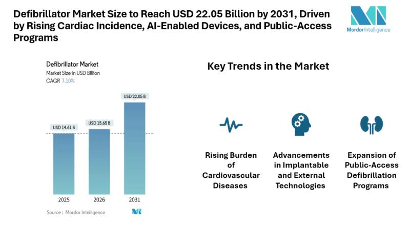 Mordor Intelligence has published a new report on the defibrillator market, offering a comprehensive analysis of trends, growth drivers, and future projections. Defibrillator Market Analysis According to Mordor Intelligence, the global defibrillator market size was valued at USD 15.65 billion in 2026 to reach USD 22.05 billion by 2031, registering a CAGR of 7.10% during the forecast period. The steady rise in sudden cardiac arrest cases, broader reimbursement coverage, and