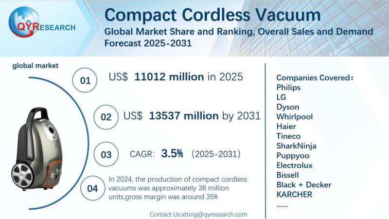 The global market for Compact Cordless Vacuum was estimated to be worth US$ 10640 million in 2024 and is forecast to a readjusted size of US$ 13537 million by 2031 with a CAGR of 3.5% during the forecast period 2025-2031.Global Leading Market Research Publisher QYResearch announces the release of its latest report "Compact Cordless Vacuum - Global Market Share and Ranking, Overall Sales and Demand Forecast 2025-2031". Based on current situation and impact historical analysis (2020-2024) and forecast calculations (2025-2031), this report provides a comprehensive analysis of the global Compact Cordless Vacuum market, including market size, share, demand, industry development status, and forecasts for the next few years.