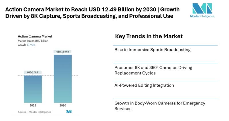 The global action camera market [https://www.mordorintelligence.com/industry-reports/action-camera-market?utm_source=abnewswire] is witnessing significant growth, with its size estimated at USD 7.09 billion in 2025 and projected to reach USD 12.49 billion by 2030. The market is experiencing a robust CAGR as prosumer-grade 8K and 360 degrees cameras become accessible to mainstream consumers. Action cameras, known for their compact, rugged, and often waterproof designs, are widely used in high-speed and adventure activities such as cycling, surfing, climbing, and skydiving. Their versatility extends beyond personal use, supporting professional broadcasting, industrial inspection, and emergency services.