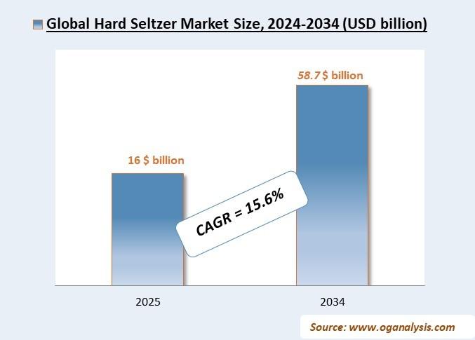 According to OG Analysis, a renowned market research firm, the Global hard-seltzer-market was valued at USD 13.6 Billion in 2024. The market is projected to grow at a compound annual growth rate (CAGR) of 15.6%, rising from USD 16 Billion in 2025 to an estimated USD 58.7 Billion by 2034.