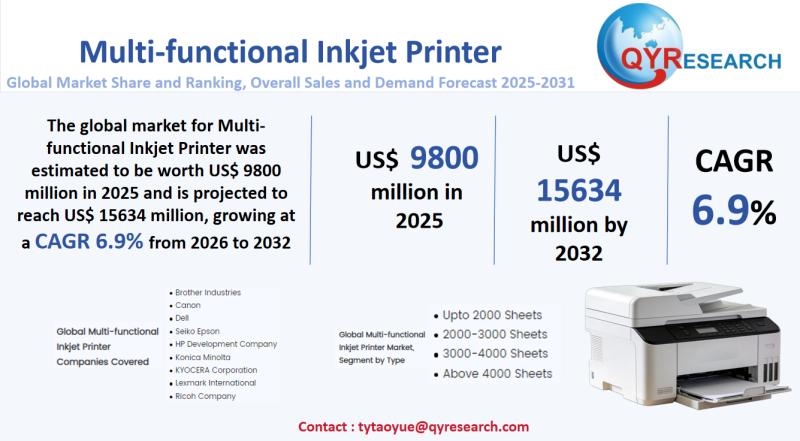 The global market for Multi-functional Inkjet Printer was estimated to be worth US$ 9800 million in 2025 and is projected to reach US$ 15634 million, growing at a CAGR of 6.9% from 2026 to 2032.