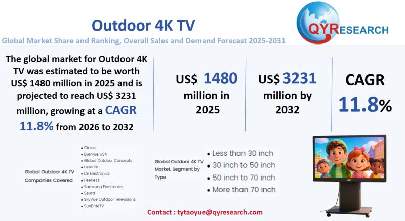 The global market for Outdoor 4K TV was estimated to be worth US$ 1480 million in 2025 and is projected to reach US$ 3231 million, growing at a CAGR of 11.8% from 2026 to 2032.