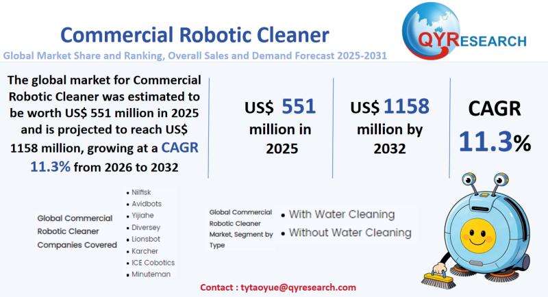 The global market for Commercial Robotic Cleaner was estimated to be worth US$ 551 million in 2025 and is projected to reach US$ 1158 million, growing at a CAGR of 11.3% from 2026 to 2032.