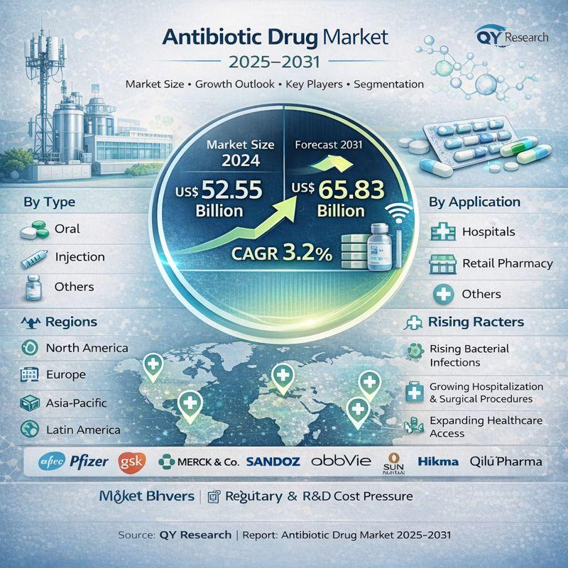 LOS ANGELES, United States - According to QY Research, the global Antibiotic Drug Market continues to play a critical role in modern healthcare as bacterial infections remain a major public health concern worldwide. As outlined in the latest report titled "Global Antibiotic Drug Market Share and Ranking, Overall Sales and Demand Forecast 2025-2031," the market was valued at US$ 52.55 billion in 2024 and is projected to reach US$ 65.83 billion by 2031, expanding at a CAGR of 3.2% during the forecast period.The report provides an in-depth, data-driven assessment of the global Antibiotic Drug market, combining historical performance analysis with forward-looking forecasts to support informed decision-making and sustainable growth strategies. Developed by experienced analysts and subject-matter experts, the study delivers validated market data, competitive intelligence, and actionable insights for pharmaceutical manufacturers, healthcare providers, investors, and policymakers.