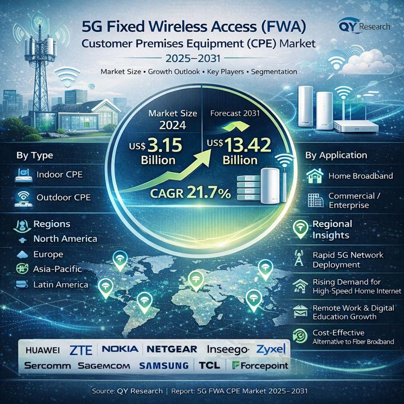 LOS ANGELES, United States - According to QY Research, the global 5G Fixed Wireless Access (FWA) Customer Premises Equipment (CPE) Market is witnessing rapid expansion as telecom operators and consumers increasingly adopt high-speed wireless broadband solutions. As highlighted in the newly released report titled "Global 5G FWA CPE Market Share and Ranking, Overall Sales and Demand Forecast 2025-2031," the market was valued at US$ 3.15 billion in 2024 and is…