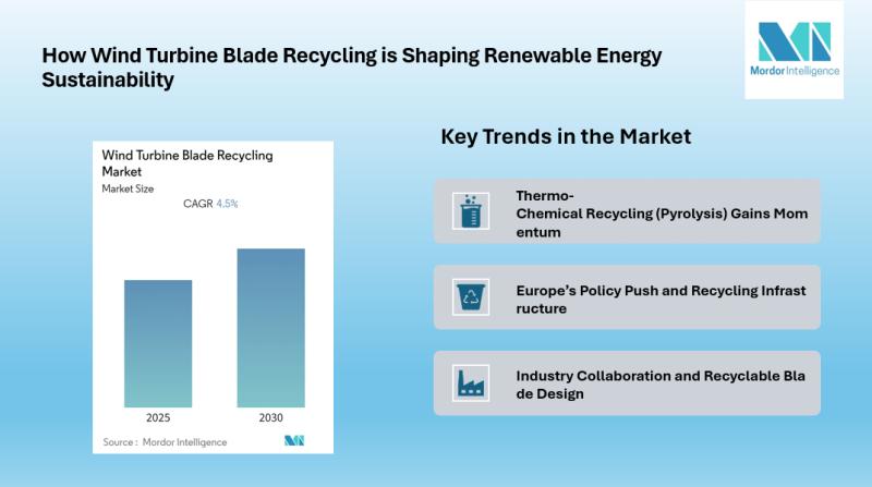 Mordor Intelligence has published a new report on the "Wind Turbine Blade Recycling Market," offering a comprehensive analysis of trends, growth drivers, and future projections.The wind turbine blade recycling market is set to grow at a CAGR of 4.5% from 2025 to 2030, driven by rising blade decommissioning, landfill restrictions, and advanced recycling methods like pyrolysis.