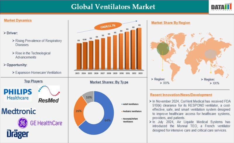 As per DataM intelligence research report" Global Ventilators Market reached US$ 6.06 billion in 2024 and is expected to reach US$ 18.35 billion by 2033, growing at a CAGR of 11.7% during the forecast period 2025-2033." Respiratory health awareness and ICU infrastructure expansion are driving ventilator adoption worldwide.