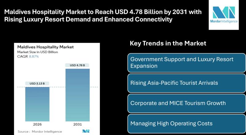 According to Mordor Intelligence, the Maldives hospitality market is poised for steady expansion, with the market projected to grow from USD 3.13 billion in 2026 to USD 4.78 billion by 2031, reflecting a compound annual growth rate (CAGR) of 8.87%. Growth is largely driven by…