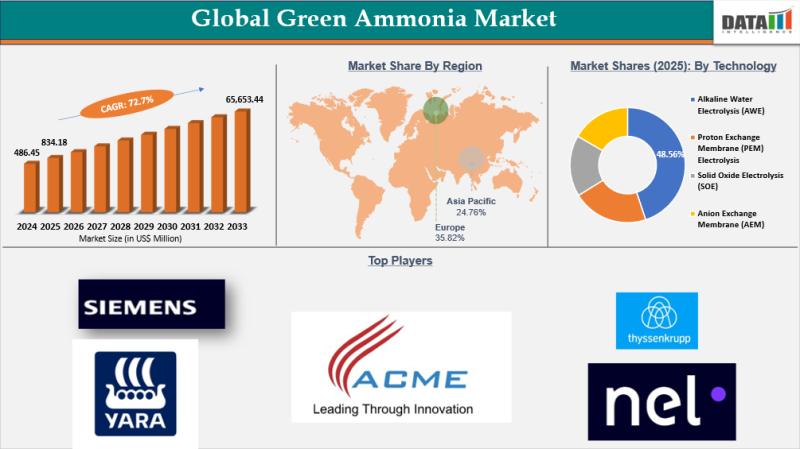 According to DMI analysis, the global Green Ammonia market reached US$ 486.45 Million in 2024, rising to US$ 834.18 Million in 2025 and is expected to reach US$ 65,653.44Million by 2033, growing at a strong CAGR of 72.7% during the forecast period from 2026 to 2033.