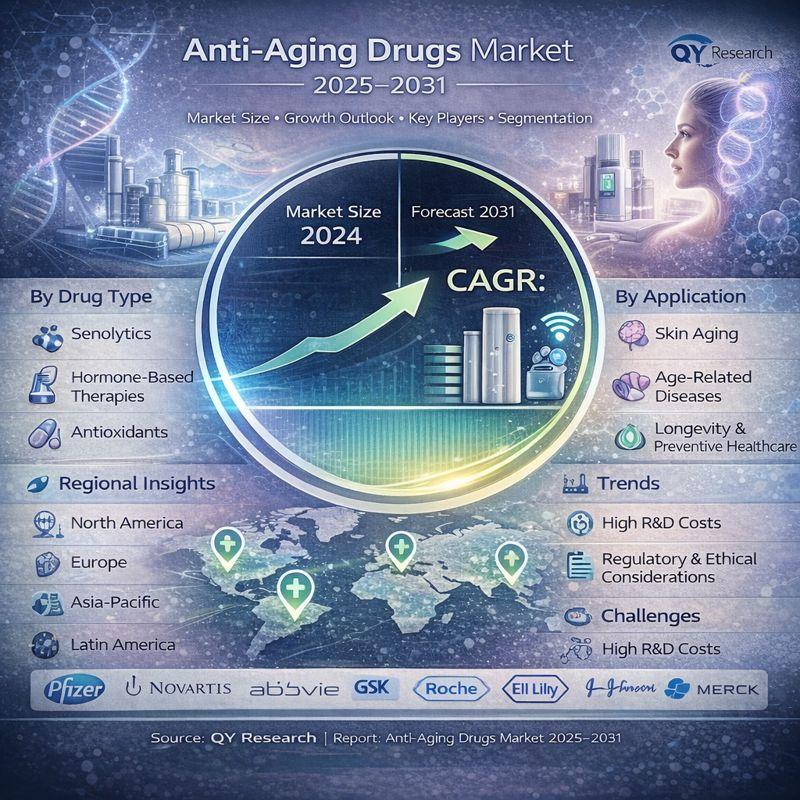 According to QY Research, a new publication titled "Global Anti-aging Drugs Market Share and Ranking, Overall Sales and Demand Forecast 2025-2031" provides an in-depth, data-driven analysis of the global Anti-aging Drugs market to support informed decision-making and sustainable growth strategies. Authored by experienced market analysts and subject-matter experts, the report delivers accurate market data, validated insights, and actionable recommendations for industry participants. It evaluates historical performance alongside future forecasts to clearly explain competitive dynamics, key growth drivers, market challenges, and emerging opportunities. With detailed coverage of market dynamics, segmentation, leading companies, and regional trends, this comprehensive report serves as a reliable strategic resource for businesses looking to gain a competitive edge in the global Anti-aging Drugs market.