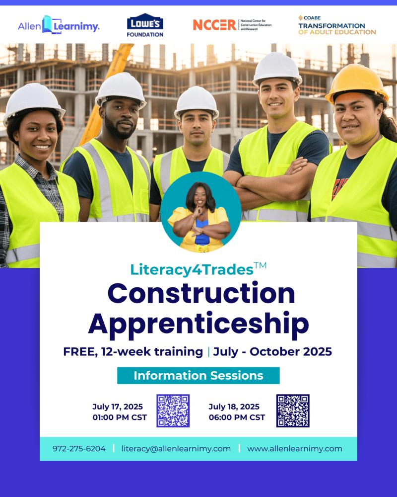 DALLAS, TX - January 2026 - Build the Trade: Construction-Literacy Apprenticeship officially launches this month as a free 12-week program for adults (21+) interested in starting a career in carpentry, plumbing, or electrical work. Funded by COABE and NCCER grants, the program is designed to eliminate financial and literacy barriers that often prevent skilled, motivated individuals from entering the trades.Participants will earn OSHA-10 and NCCER Level 1 certifications, gain real-world jobsite experience, and receive tailored instruction in reading, math, and communication-all aligned with the construction-specific tasks of reading blueprints, calculating measurements, and writing site documentation.