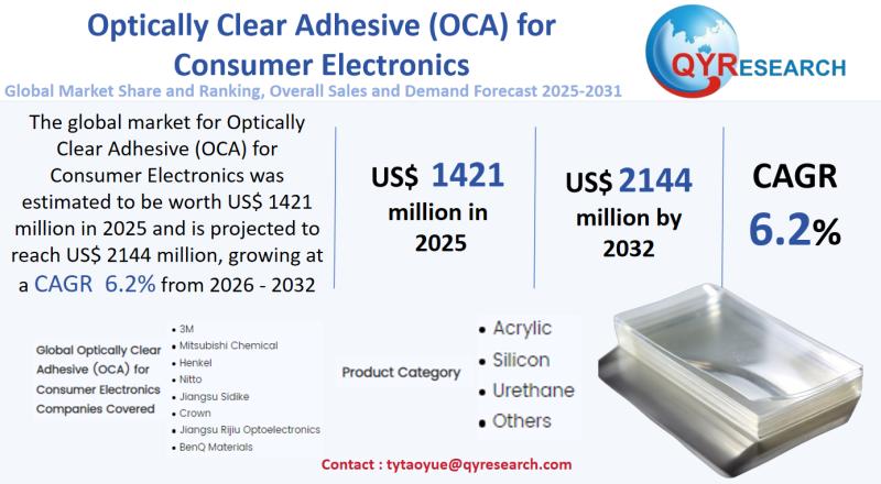 The global market for Optically Clear Adhesive (OCA) for Consumer Electronics was estimated to be worth US$ 1421 million in 2025 and is projected to reach US$ 2144 million, growing at a CAGR of 6.2% from 2026 to 2032.